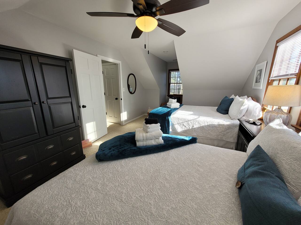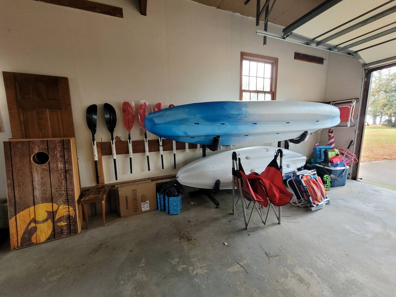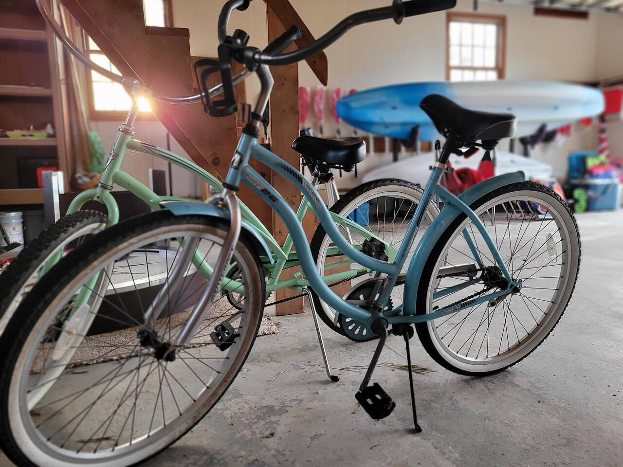 The driveway allows for off-street parking for about six vehicles. Walk or ride bikes to the beach; it's just two blocks away. Both kayaks (2 -3 person and 1 person) have wheels to easily roll down to the beach.